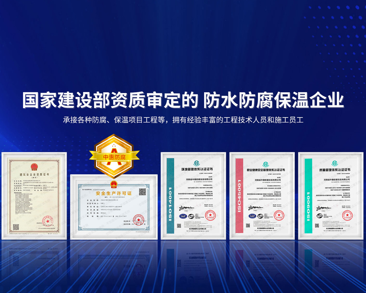 公司經營范圍:防水防腐保溫工程;消防設施工程;建筑裝修裝飾工程;建筑機電安裝工程;電力工程;建筑工程;石油化工工程;工業清洗工程;油罐清洗工程;鋼結構工程;環保工程;模板腳手架工程;電纜防火封堵、防污閃噴涂、外墻外保溫工程;各類施工勞務作業;設備維修、船舶鉚焊、涂裝;電力工程材料、建材、防水材料、防火材料、防腐保溫材料銷售,并相繼通過了GB/T19001-2008idtISO9001:2008GB/T50430-2007質量管理體系認證證書。GB/T24001-2004idtISO14001:2004環境管理體系認證證書。GB/T28001-2011idtOHSAS18001:2007職業健康安全管理體系認證證書。公司是中國防腐蝕于防護協會、中國施工企業管理協會、電力協會和中國鋼結構防水協會會員單位。 公司的經營業務涵蓋了石油、化工、電力、冶金、煤炭、船舶、國防、燃氣、水利、環保、交通運輸、航空及國防軍工和輕紡市政等行業的防腐保溫絕熱設備。鋼結構安裝、防火、防水、金屬噴鍍、聚脲噴繪、陰極保護、防滲透堵漏、玻璃鋼及各種磚版材料襯里、橡膠襯里、煙氣硫和耐酸溶劑腐蝕等工程施工。公司連續十年榮獲“省市先進施工企業”“安全生產先進單位”“重合同,守信用企業”和“AA***資質企業”的稱號。2000年被命名為市級文明單位,2002年被國家工商行政管理局命名為“重合同,守信用的企業”、被中國工業防腐蝕技術協會命名為“防腐蝕企業,能源節約及環境保護領域有豐富的經驗和***的業績。工程一次交驗合格率100%。其中攀枝花鋼鐵公司煉鐵廠四號高爐及熱風爐防腐工程、上海寶鋼公司煤氣柜防腐工程、撫順石油一廠裝置防腐項目、齊魯石化公司稀烴廠高塔防腐工程、吉林化學工業公司煉油廠油罐防腐工程、天津石化熱電廠六號爐頂棚聯絡管保溫工程、大慶油田(太倉)力神泵業工程、中國化學工程第十一建設工程、中原油田勘探局工程、中國石化銷售有限公司華北分部、魯皖輸油管道工程、貴州開磷息烽合成氨工程、陜西黃陵煤化工程、中國石油天然氣西部管道塔里木輸油工程、邯鋼集團邯寶鋼鐵公司煉鐵工程、德州供電工程、吉寶(南通)船廠工程,偃師華潤熱力工程、鄭州熱力總公司。 河南省中惠防腐安裝有限公司愿以豐富的施工經驗,***的技術,***的設備,***的管理,***的服務,竭誠為國內外廣大的用戶提供***滿意、******的工程作品。 我公司愿與國內外同仁一道,團結協作,共同推進防腐蝕行業發展! 公司地址:河南省長垣縣建設路北段360號 固定電話:0373-8866488 郵編:453400 網址:http://www_zhff_com_cn.wagnumsproperties.com